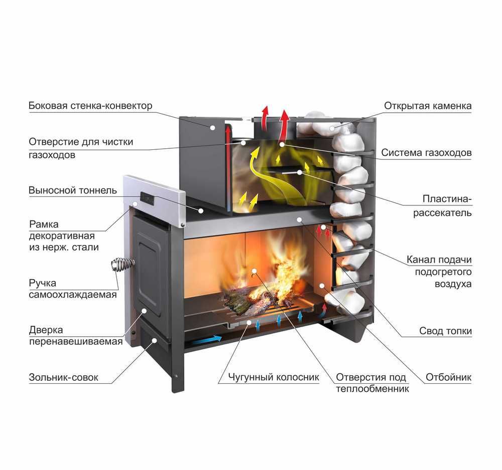- Большая площадь поверхности теплопередачи. Камни сильно и равномерно нагреваются от всех стенок печи, максимально снимая температуру и защищая от прямого излучения.