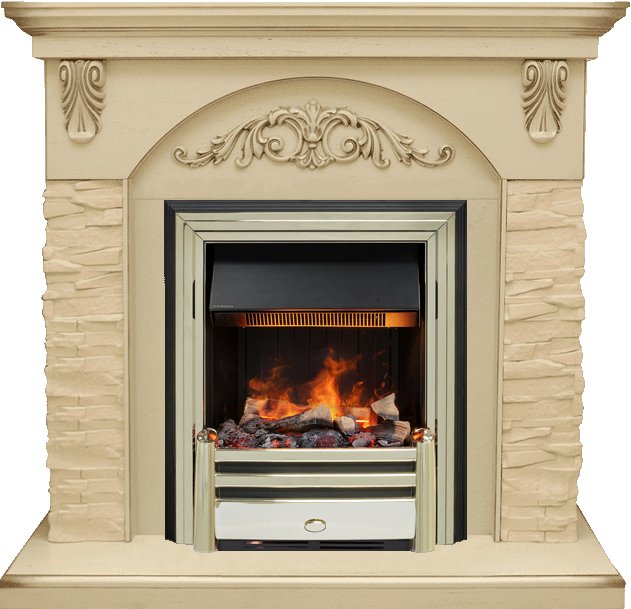 Электрокамин выполнен в золотом цвете. Золото – это материал, который никогда не выйдет из моды, это свидетельство безупречного вкуса и верности традициям. Цвет золота подчёркивает неповторимый стиль и необычность этого камина. К очагу можно подобрать любой портал, который подойдет к вашему интерьеру и станет его лаконичным продолжением. В очаге Dimplex Cavendish применяется эффект «живого» пламени Opti-Myst, в основу которого заложен инновационный принцип имитации огня - в очаге мерцает пламя, практически неотличимое от настоящего. В камине используется муляж дров ручной работы, которые невозможно отличить от настоящих поленьев, а благодаря подсветке создается полная имитация жарко пылающего очага.