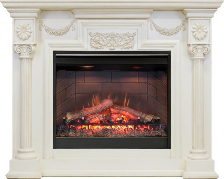 Обрамление для камина сделано из высококачественных материалов. Резной декор украшает фронтальную поверхность портала, а зона очага обрамляется изящными колоннами.