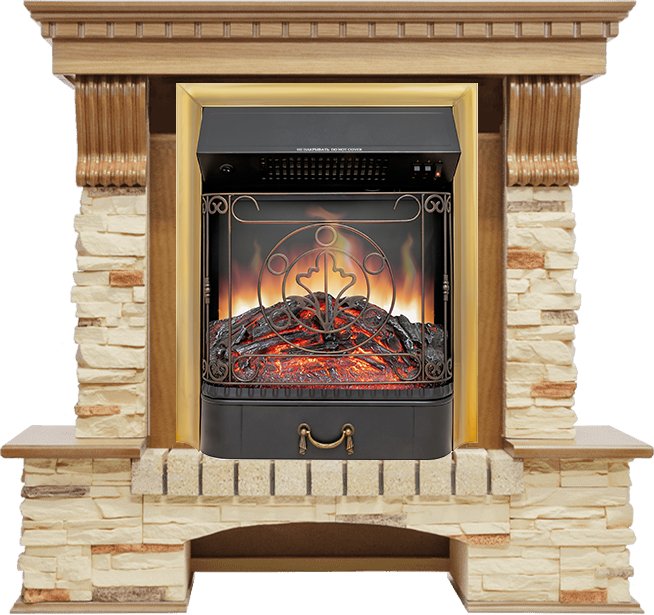 Модель представлена в нескольких вариантах, различающихся как по принципу установки (угловой или пристенный), так и цветовым решением облицовочного камня и деревянных элементов. Декорирована резными вставками в античном стиле.