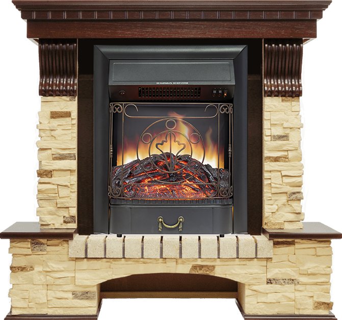 Модель представлена в нескольких вариантах, различающихся как по принципу установки (угловой или пристенный), так и цветовым решением облицовочного камня и деревянных элементов. Декорирована резными вставками в античном стиле.