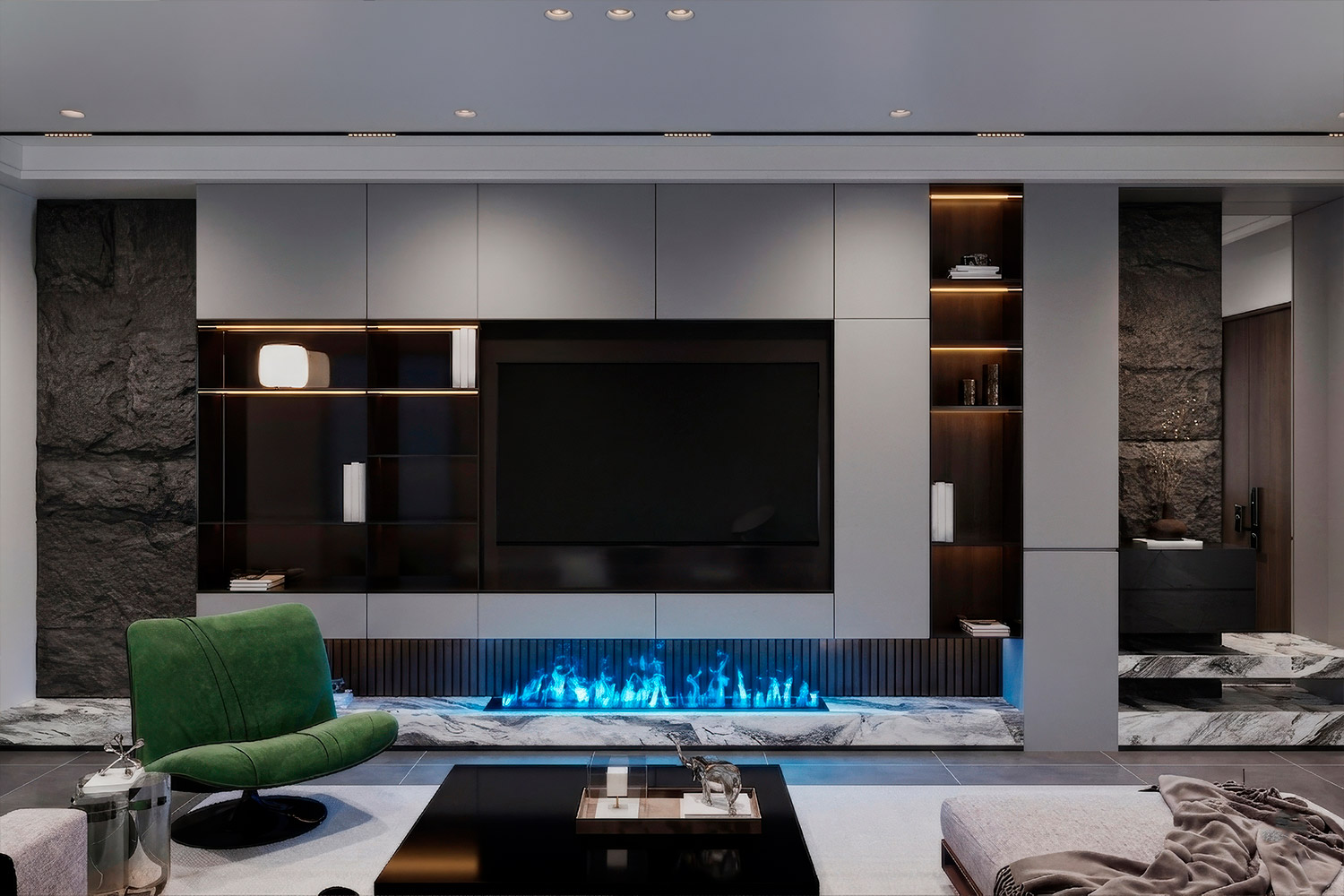 - Метровая линия огня: ширина очага составляет около 1000 мм, что создает по-настоящему впечатляющий визуальный акцент в просторных гостиных, залах или коммерческих зонах