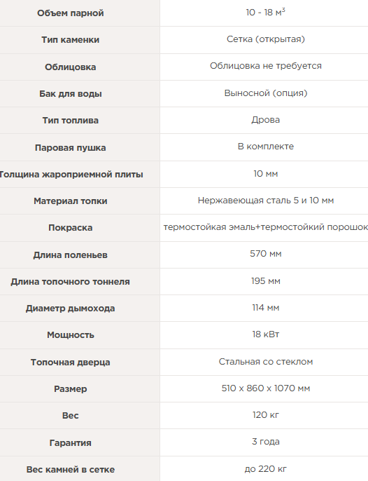 Объемная каменная загрузка в съемную сетку не позволяет перегреть Вашу парную и позволяет получать большое количество пара, толстый металл топки и дымовых каналов обеспечит высокий ресурс печи (до 10 лет).