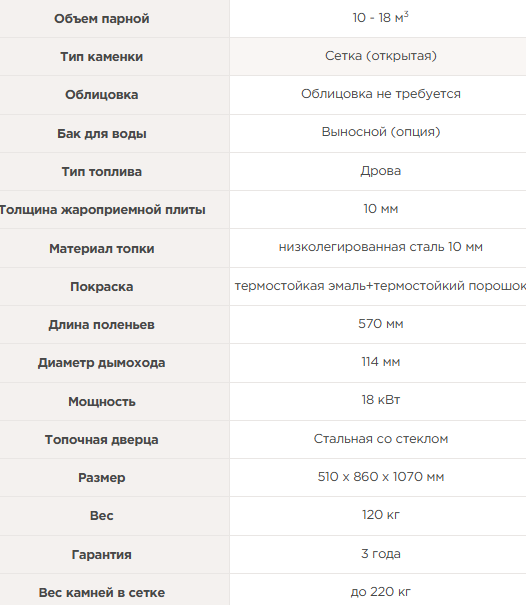 Объемная каменная загрузка в съемную сетку не позволяет перегреть Вашу парную и позволяет получать большое количество пара, толстый металл топки и дымовых каналов обеспечит высокий ресурс печи (до 10 лет).