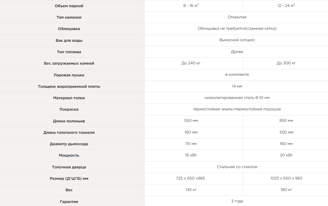 Объемная, открытая каменка позволяет скрывать инфракрасное излучение от нагретых стенок топки, а большое количество камней позволит получать большое количество пара, толстый металл топки и дымовых каналов обеспечит высокий ресурс печи (более 15 лет).