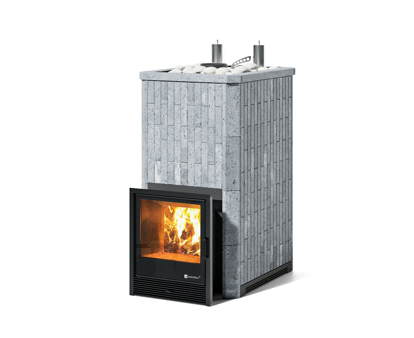 - Печь Геленджик К в полноценном наборном кожухе - Марка стали - AISI 321, Варианты кожуха - Пироксенит, Вид топлива - Газ Комплектация с САБК-50