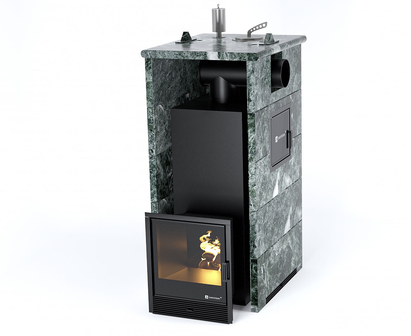- Печь Геленджик М2 в трехстороннем кожухе с открытым верхом с боковым подключением - Вид топлива - Дрова, Марка стали - AISI 430, Варианты кожуха - Талькохлорит, Исполнение дверки - Справа, Защита топки - Защ. экраны, Боковое подключение дымохода - Слева